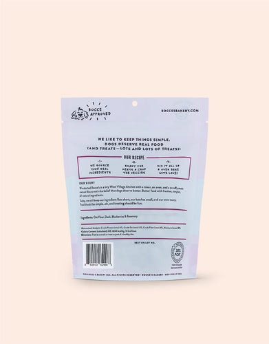 Ingredients: Oat Flour, Duck, Blueberries, RosemaryGuaranteed Analysis: Protein: 11% Fat: 12% Fiber: 4% Moisture: 8% Calories: 14 Cal/treat